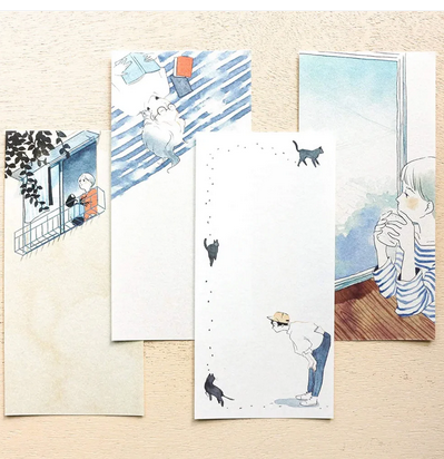 Designed by Sayuri Fujimaki, this ippitsusen captures quiet, sunlit moments of solitude - standing on a balcony, gazing out a window, drifting off with a book in hand... Each scene feels like a fleeting glimpse into a peaceful afternoon, where your words naturally become part of the imagery, adding layers of emotion to the design. The watercolor tones and delicate details evoke the nostalgic charm of an old Japanese animated film, creating a sense of calm and timeless beauty.