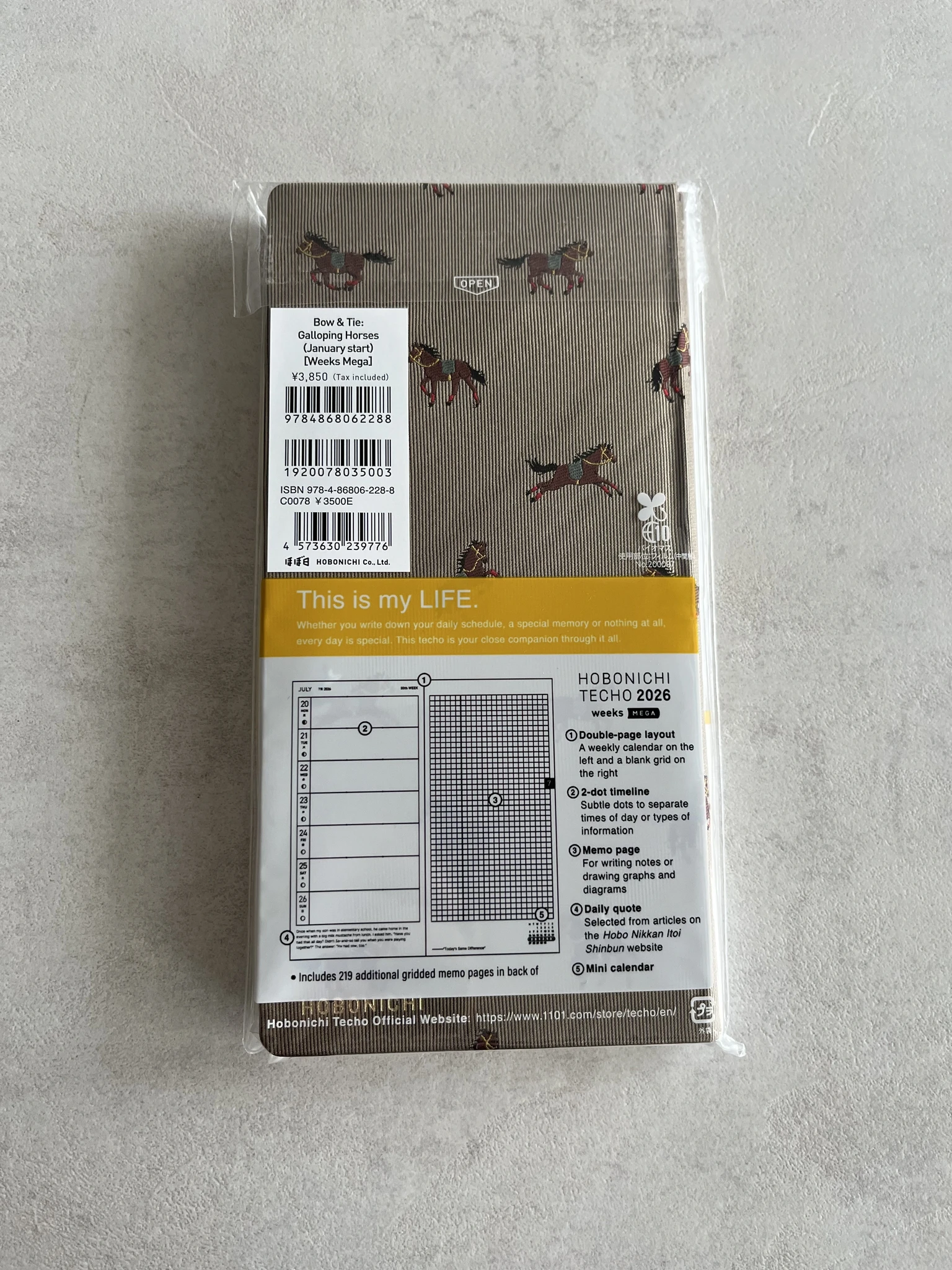 Products ⟩ Vintage and preloved [destash] Hobonichi Weeks Mega 2026 This is a destash listing.One Hobonichi Weeks Mega 2026 Bow & Tie Galloping Horses in an OPENED package, otherwise new & unused. Add to cart €42 Share: Follow Jonna Studio on Instagram to stay tuned for the latest updates and new arrivals.