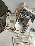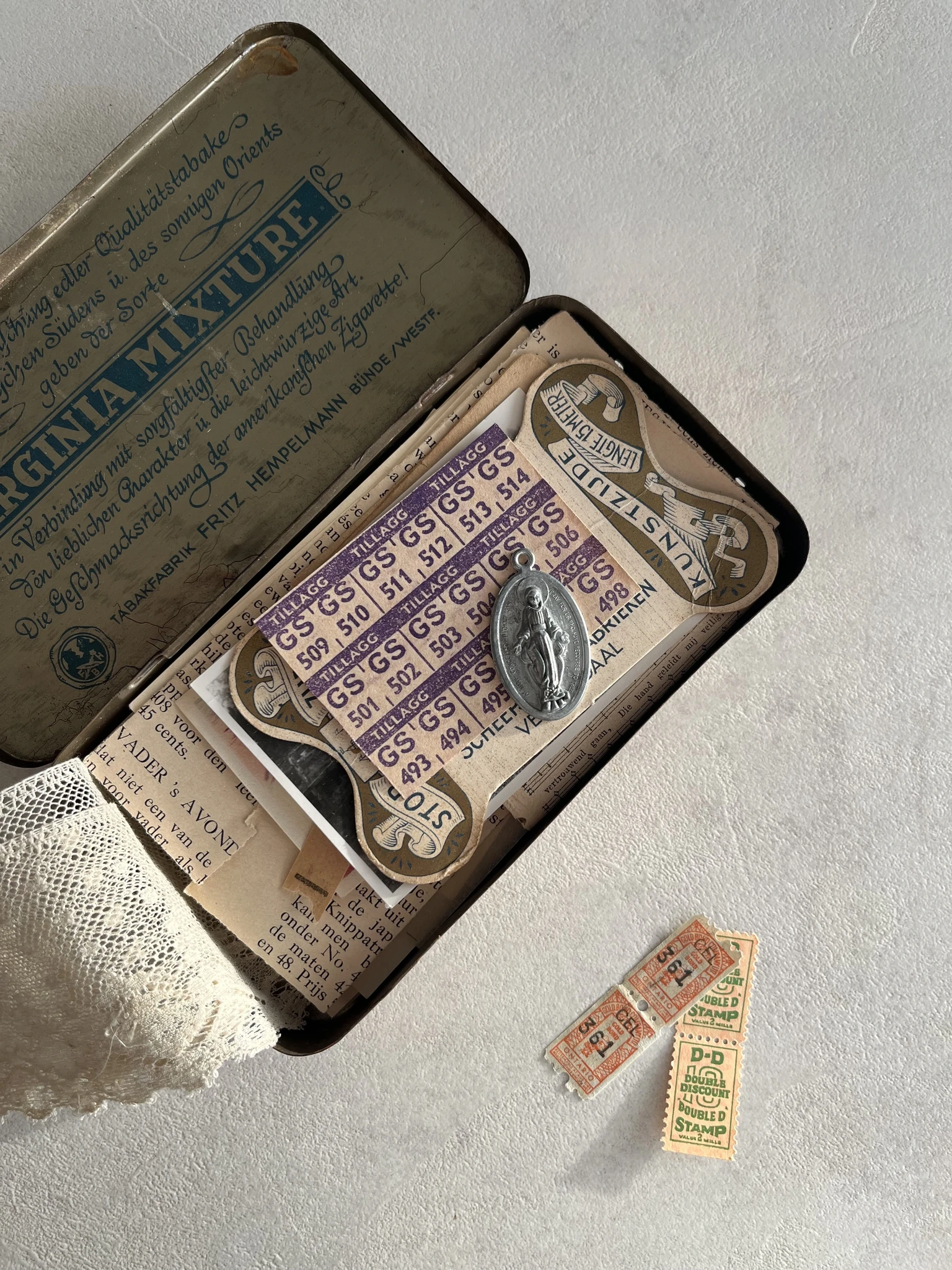 Tucked inside a beautifully worn vintage metal tin you’ll discover a curated collection of over 40 pieces of real, timeworn ephemera—each one whispering stories from decades past. This one-of-a-kind trove includes a nostalgic mix of aged book page scraps, lace, medallion, old receipts, lottery tickets, vintage photos, delicate tickets, and assorted paper fragments—all in a variety of shapes and sizes, thoughtfully selected to ignite your creativity.