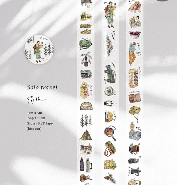 Kiss-cut PET tape Solo travel by Pion. This PET tape, featuring a convenient kiss‑cut pattern, gives your journaling, scrapbooks, and planner layouts that extra flair.