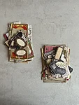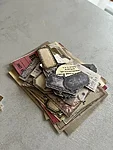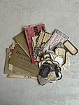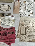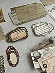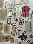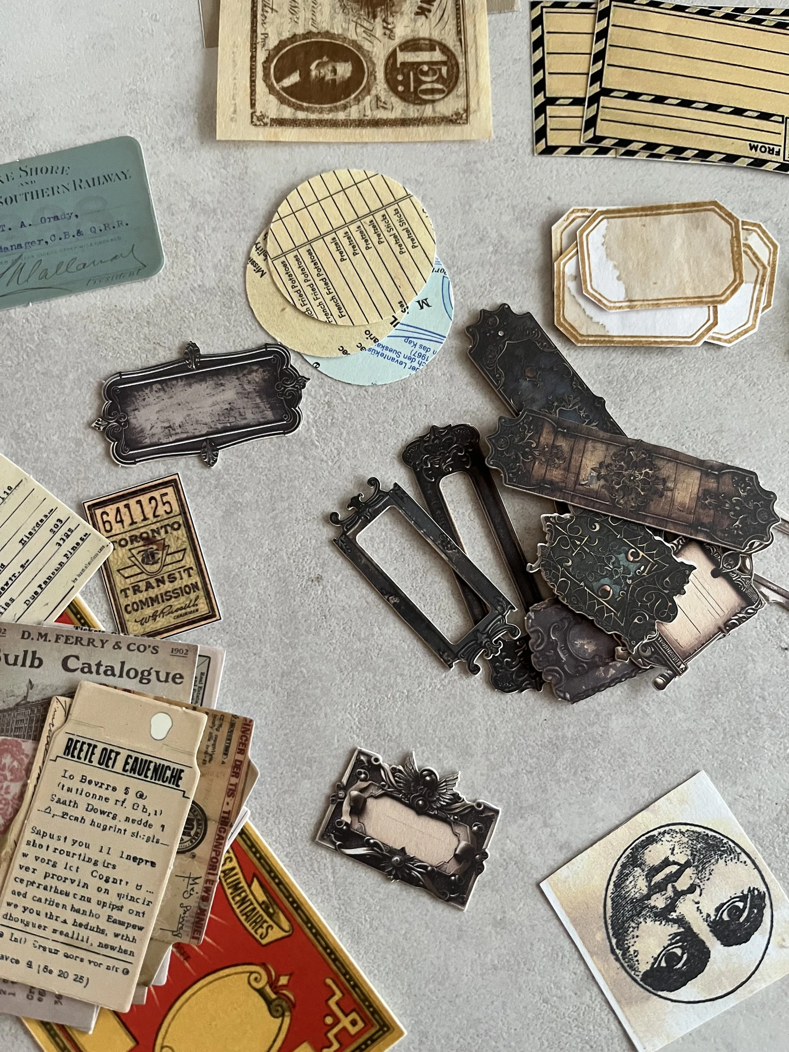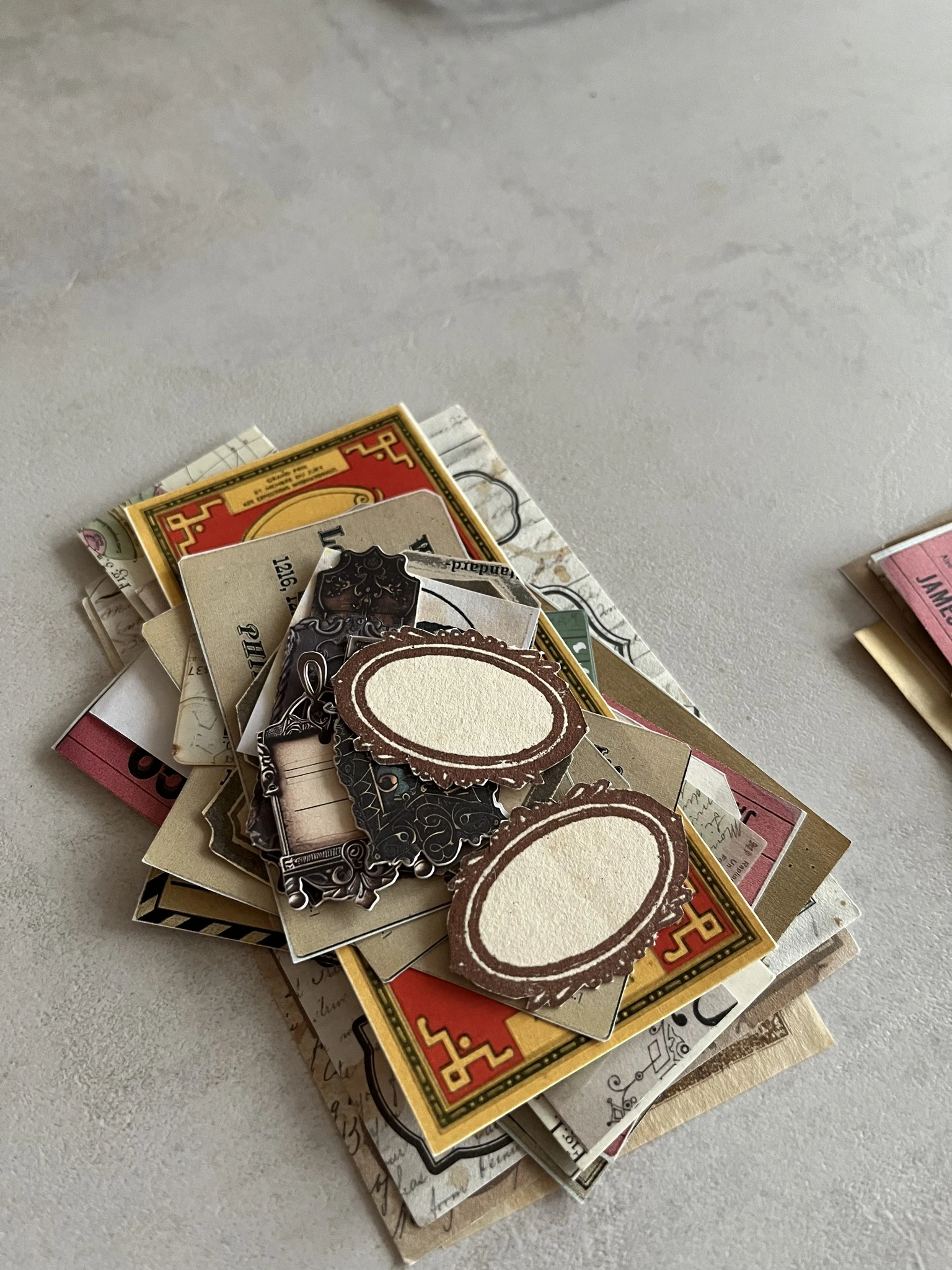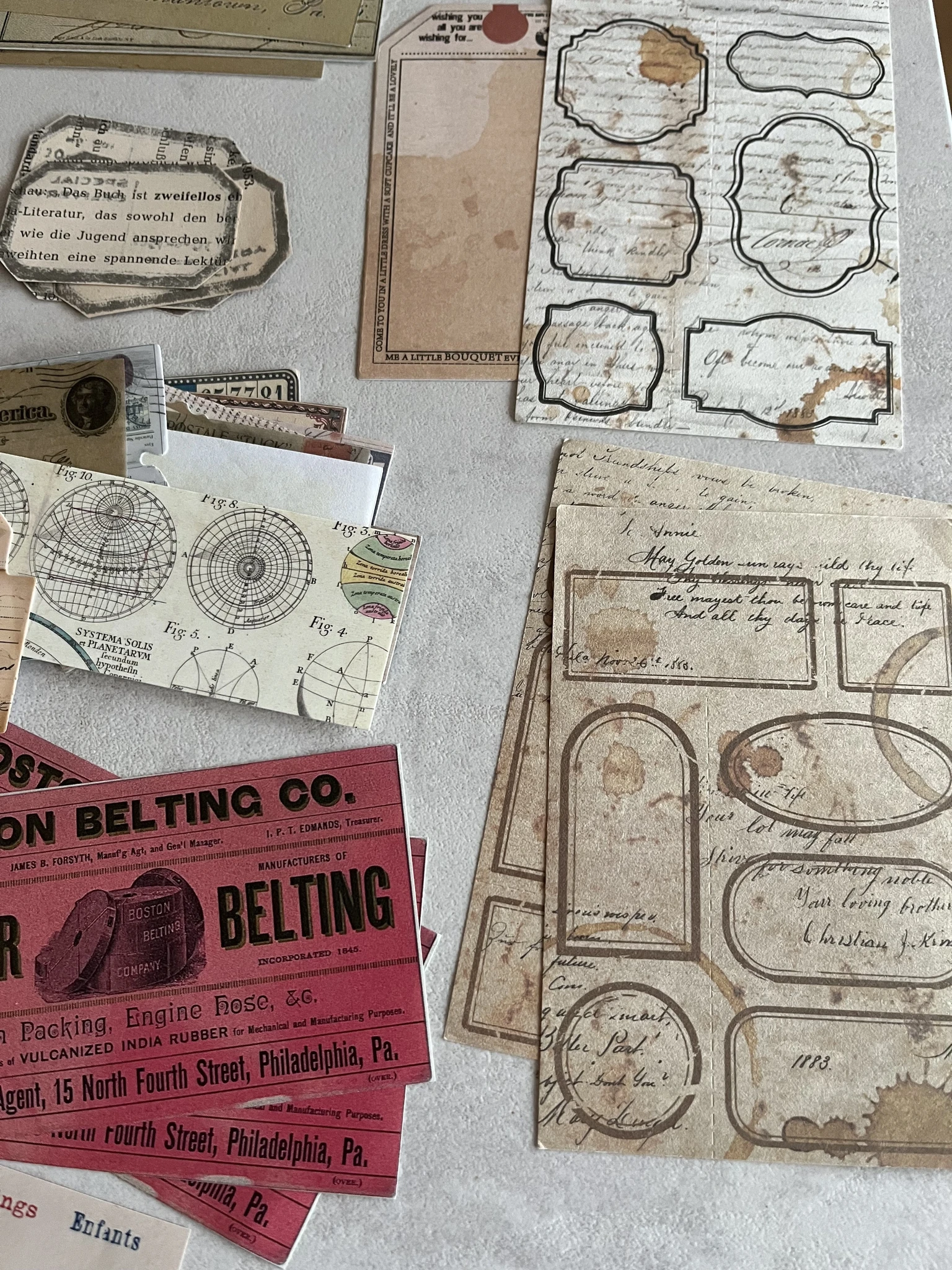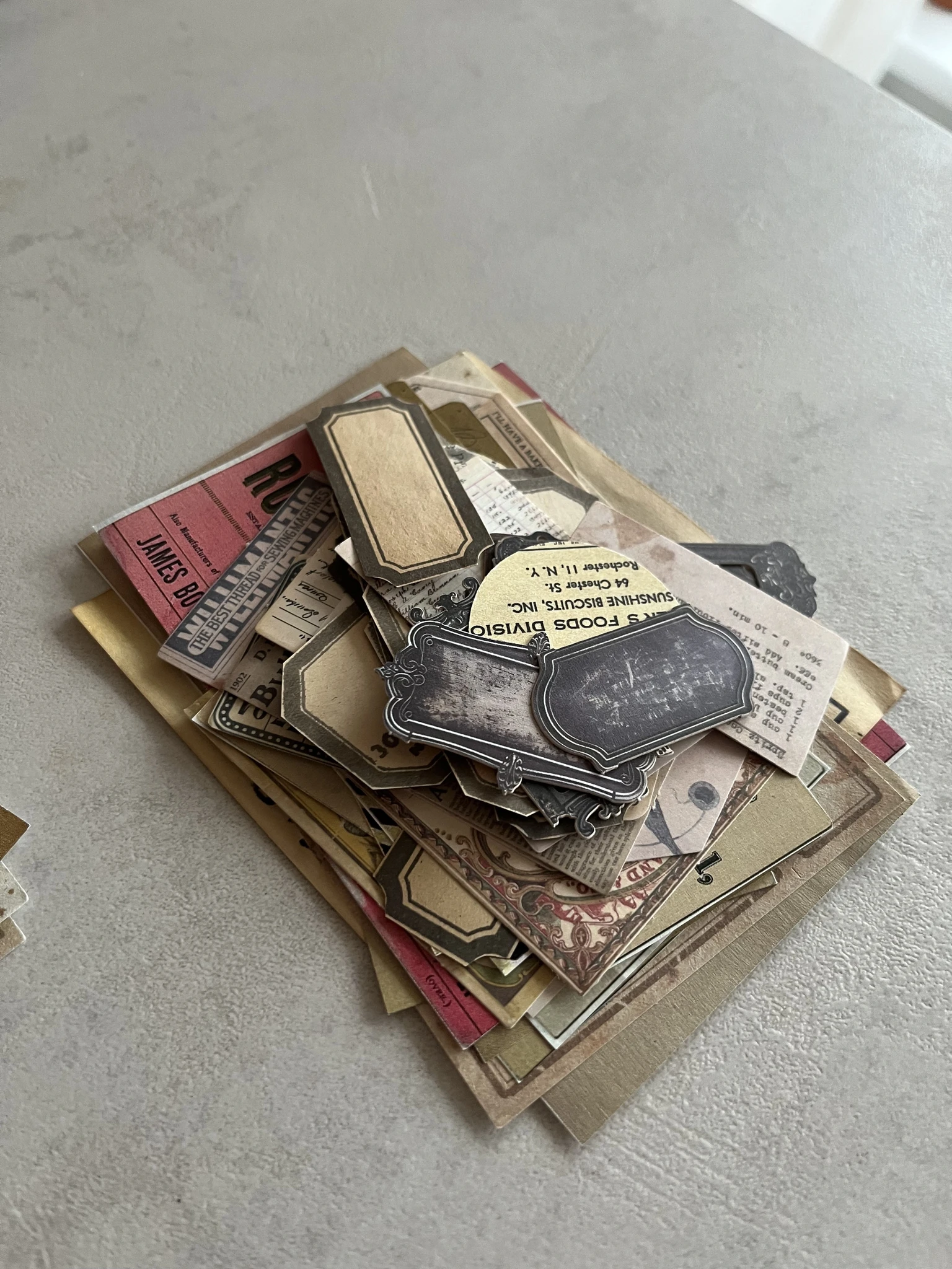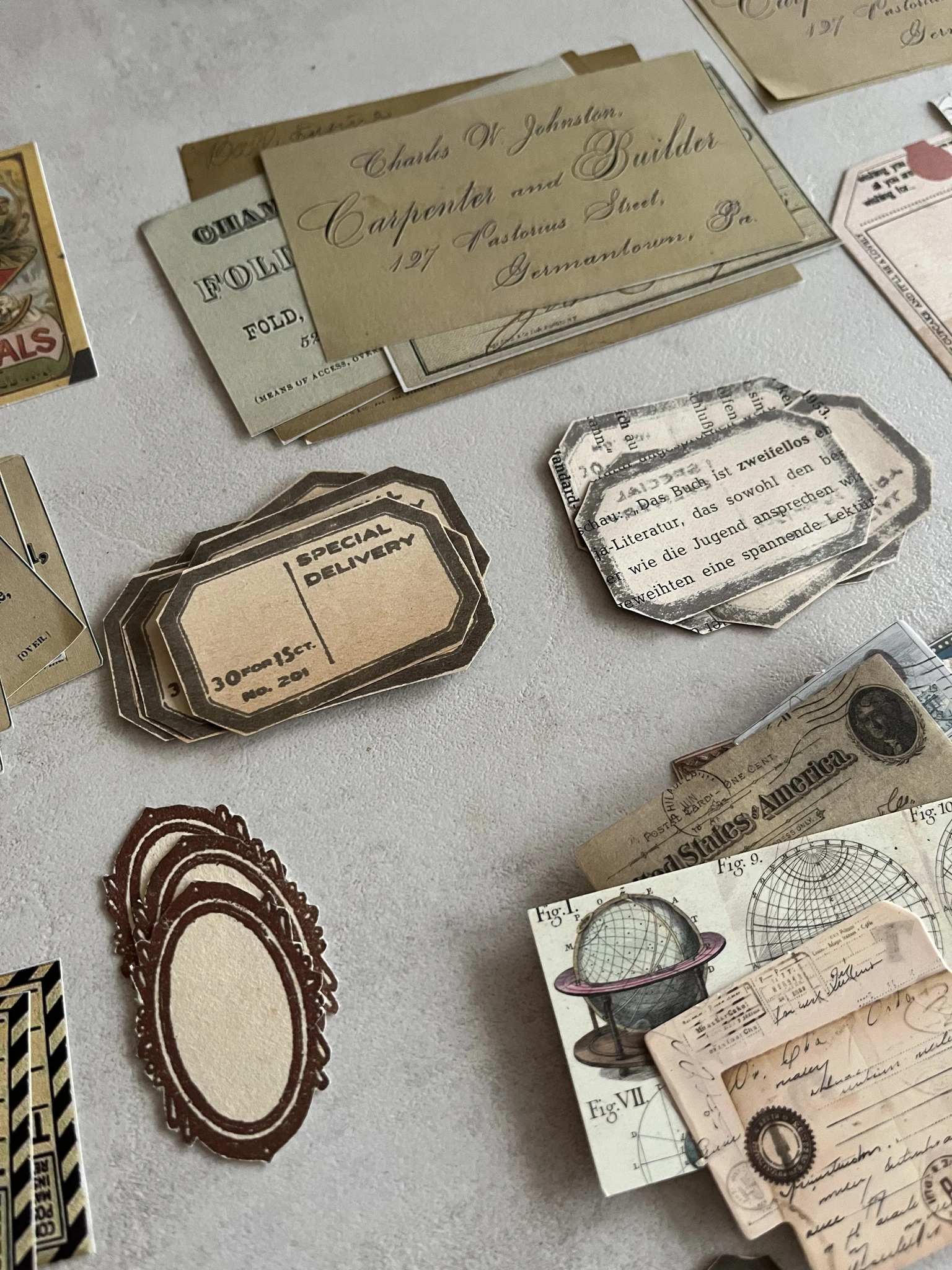 Komplekt väga erinevaid junk-journal stiilis vintage-vaibiga väikeseid kollaažipabereid. Paberite hulgas nii trükimaterjali, laserprinteriga prinditud vintage-reproduktsioone, templijäljendeid. Osa pabereid kohviga värvitud.