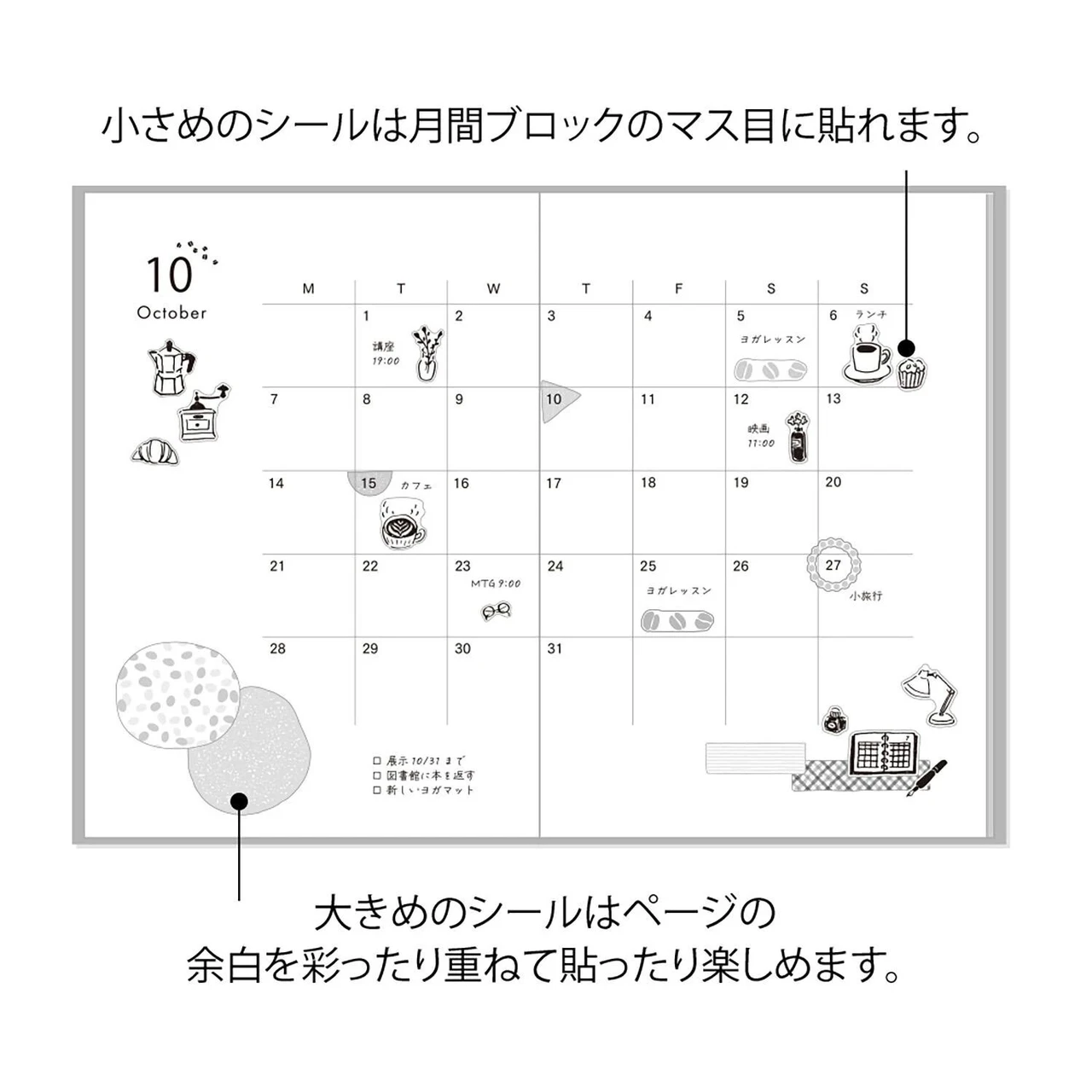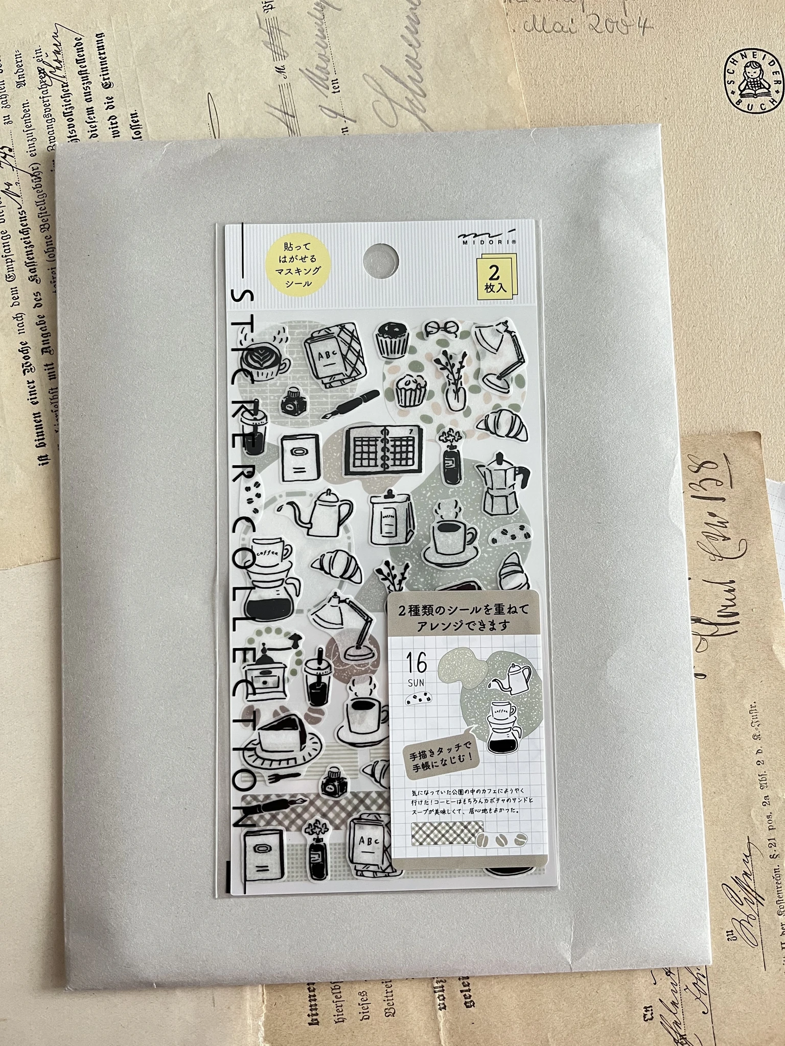 Kohvisõprade kleebiseleht "Monotone Café" Jaapani brändilt Midori. Väikesed kleebised sobivad ideaalselt kaunistama planeerijat või märkmikku.