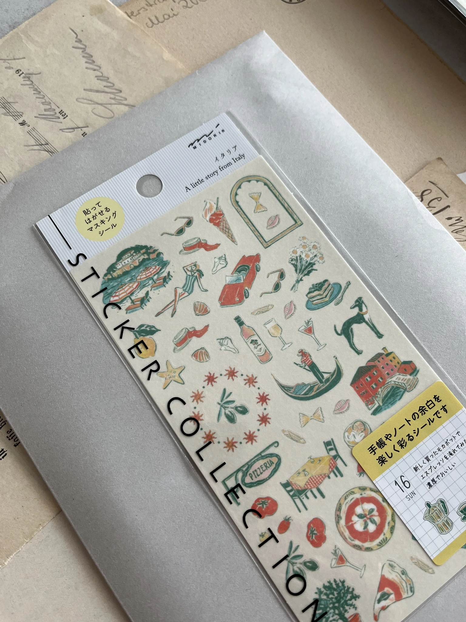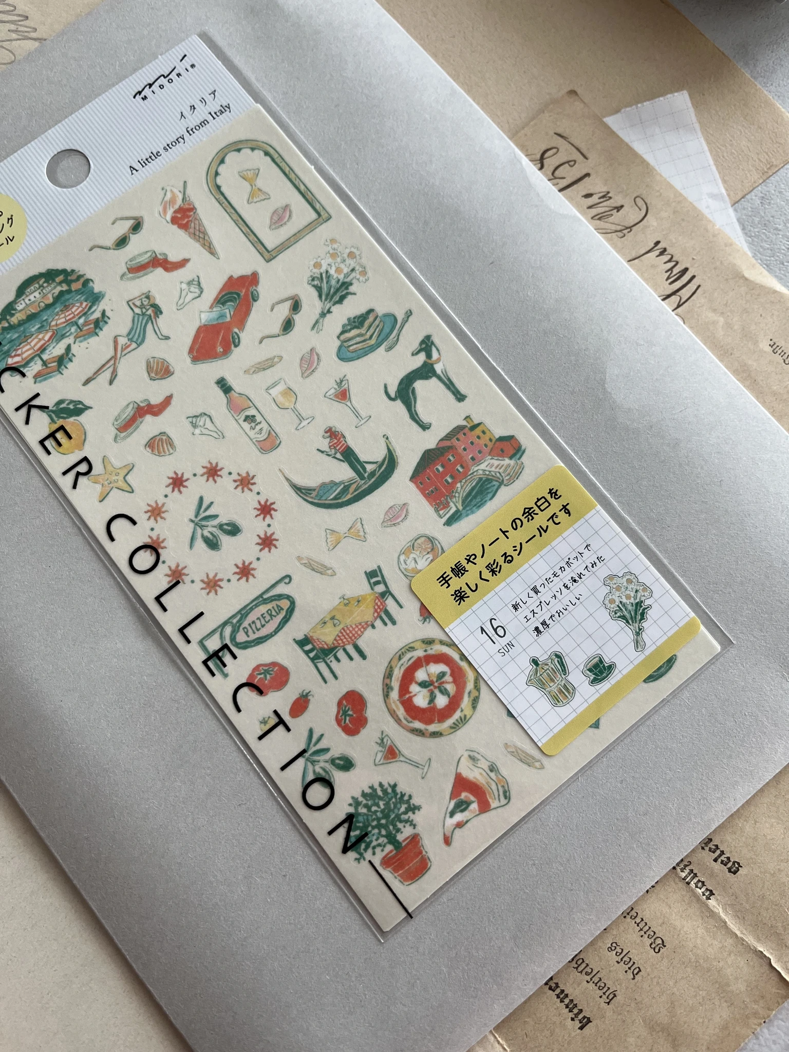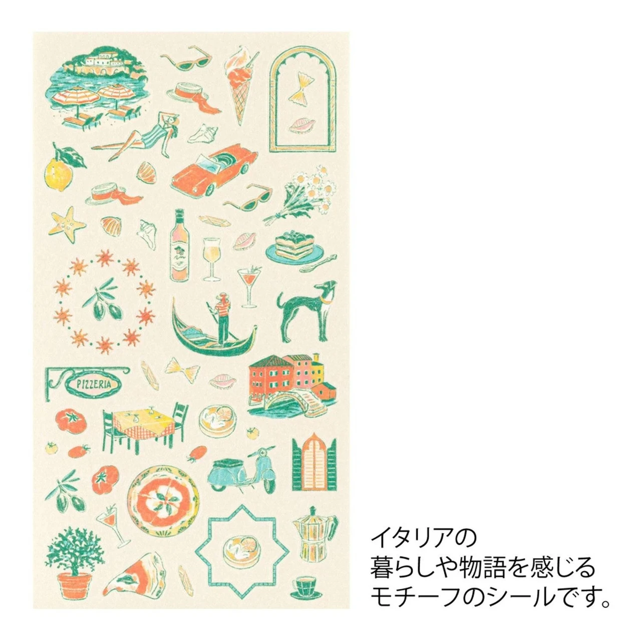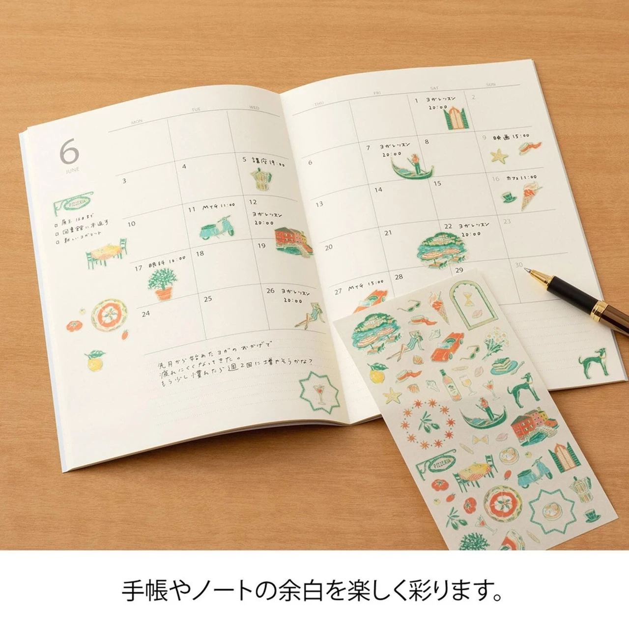 Linnaelu motiividega kleebiste leht "Italian motifs" Jaapani brändilt Midori. Väikesed kleebised sobivad ideaalselt kaunistama planeerijat või märkmikku. Samas sarjas saadaval ka Korea, Prantsuse ja Jaapani motiivid.